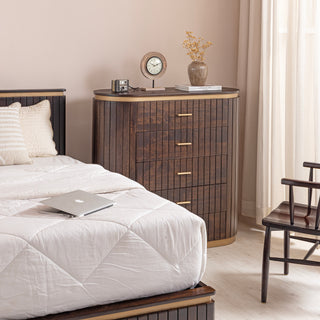 Timeless and refined, the Piano Mango Wood 5 Drawer Tallboy in Walnut brings warm, vertical storage to modern residential interiors. Crafted from mango wood with a rich walnut finish, this tallboy showcases signature vertical fluted drawer fronts, paired with clean metal handles and a coordinating metal base for a sleek, contemporary aesthetic.
